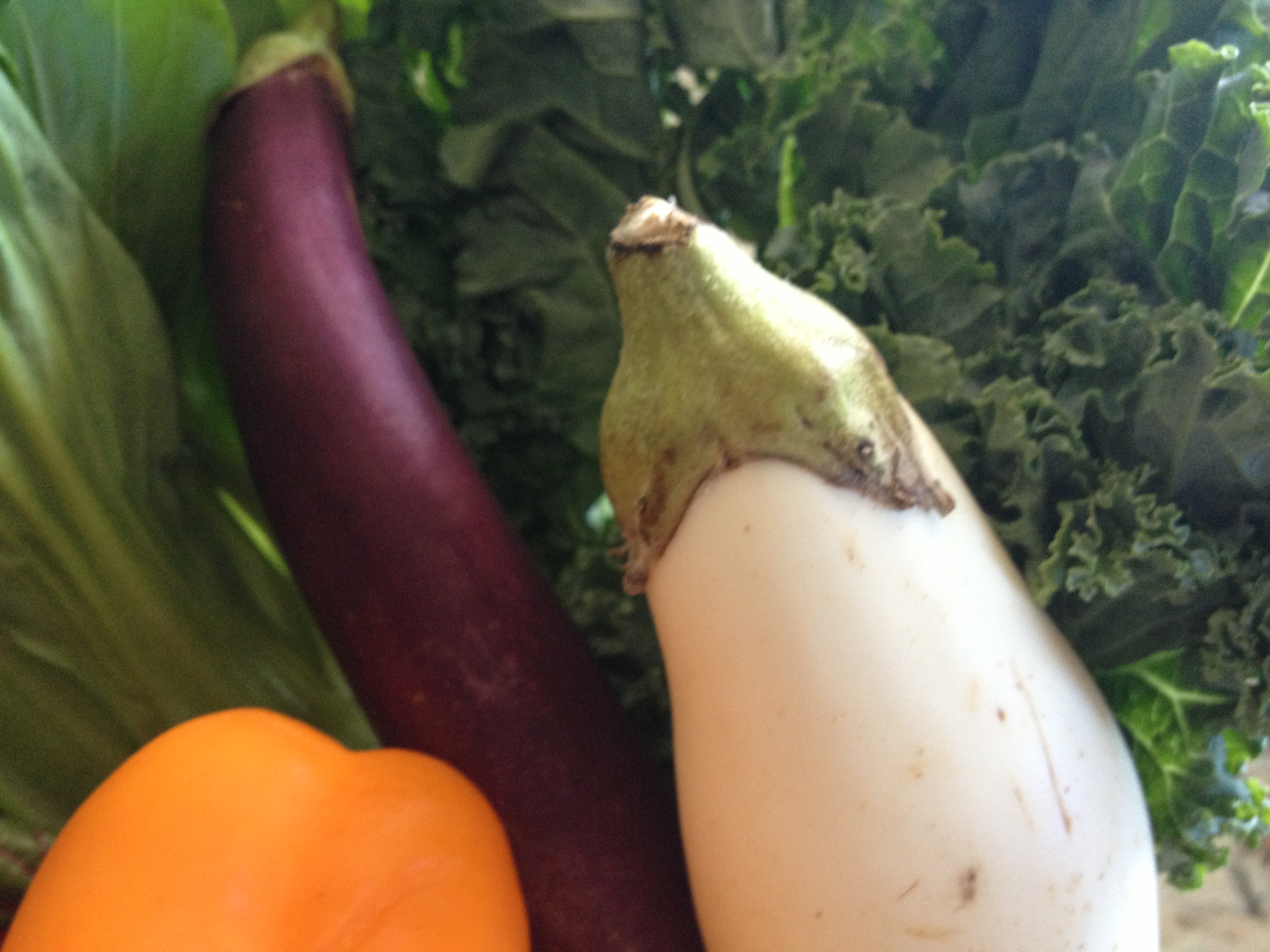 The wonderful part of this experience is discovering new foods. The first time I got my CSA box this past summer, I found some white, pear-shaped vegetables that looked like eggplants. They indeed were eggplants. I never knew that eggplant could be white!